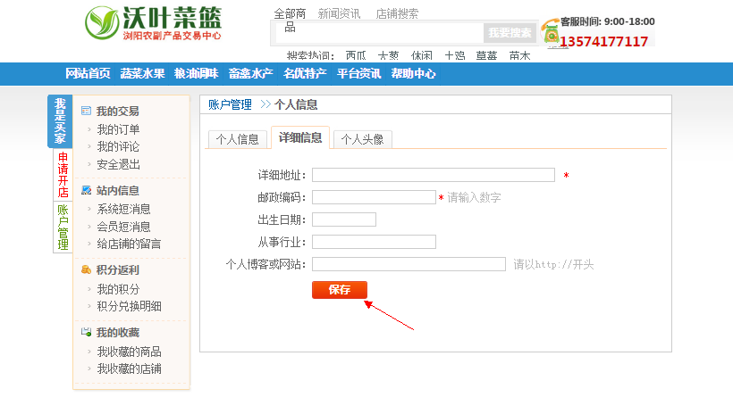 4.填寫詳細(xì)信息,點(diǎn)擊【保存】。注冊(cè)會(huì)員成功,您就可以愉快暢游商城中,沃葉菜籃祝您天天開心!